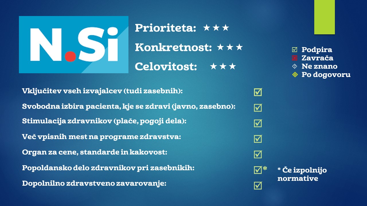 Tudi NSi bi v javno mrežo vključila vse razpoložljive kapacitete, ki bi se morale ravnati po predpisanih pravilih in biti podvržene nadzoru. Koncesije bi odpravili, namesto nje pa uvedli status samostojni nosilec zdravstvene dejavnosti, zdravnik s tem statusom pa se lahko sam odloči za delo v javnem zavodu, zasebni ustanovi ali se poda na samostojno pot.