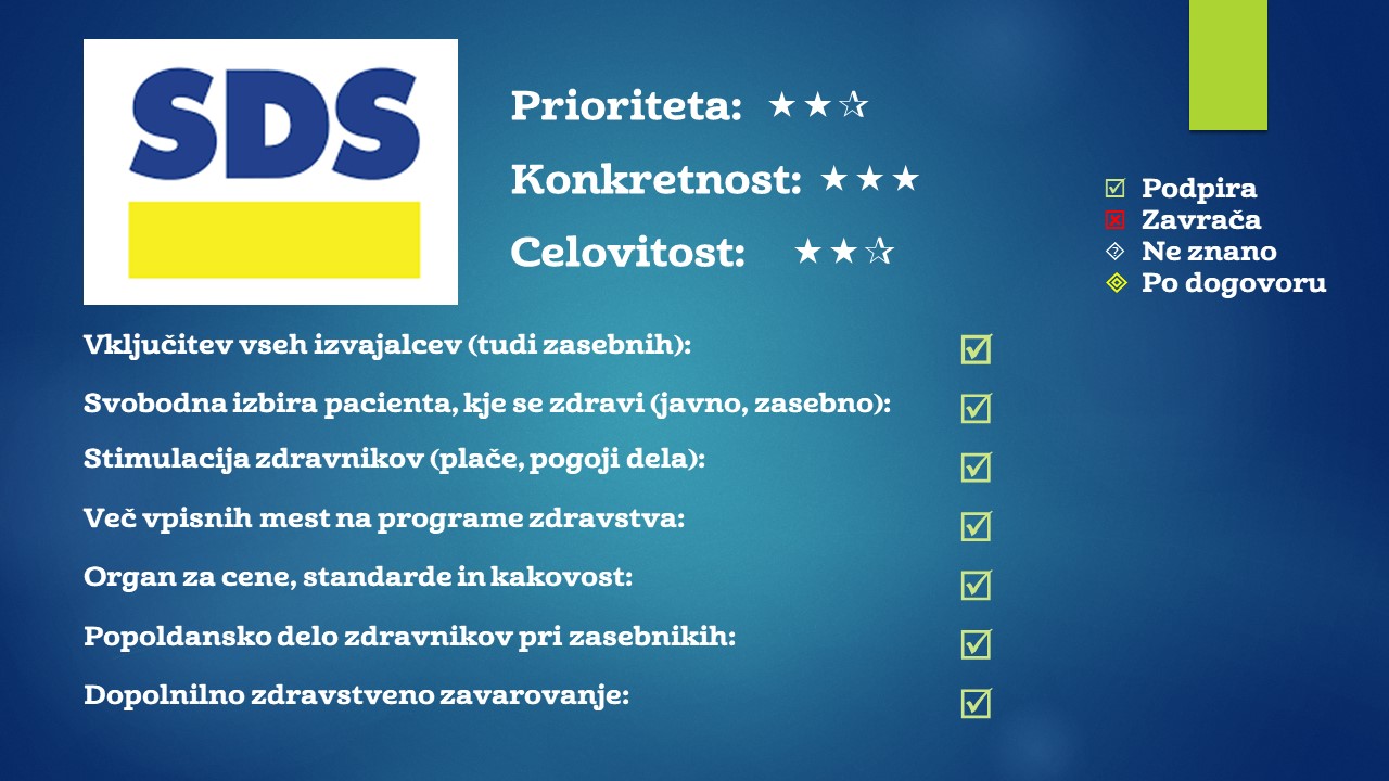 SDS bi v odpravo čakalnih vrst vključila vse ponudnike zdravstvene dejavnosti. Tudi sicer se zavzemajo za enakopravno obravnavo izvajalcev zdravstvene dejavnosti, tako javnih kot zasebnih, ki bi se enakopravno potegovali za mesta v zdravstveni mreži, v kolikor zadostujejo standardom, presežne zmogljivosti pa bi lahko ponudili na trgu.