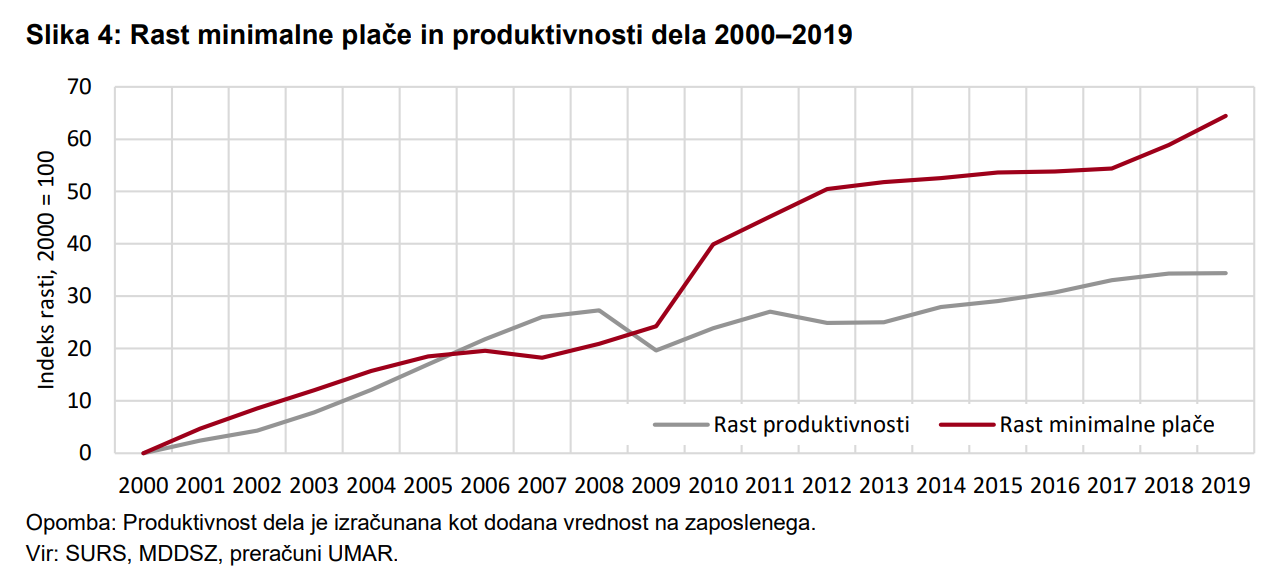 Urad za makroekonomske analize in razvoj (Umar) v svojianalizi iz leta 2020 ugotavlja, da je imela Slovenija v obdobju 2008-2013, v času krize torej, največjo realno rast minimalne plače v EU. Razmerje med minimalno in povprečno plačo se je v tem času povečalo z 41,2 odstotka leta 2009 na 51,4 odstotka leta 2013. Rast plač in produktivnosti, ki naj bi po ekonomski teoriji rasli skladno, sta se v tem obdobju ostro razcepili, nato pa se je razkorak ustalil (spodnji graf).