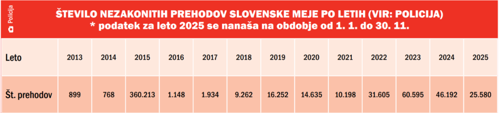 Potem ko je Evropska unija leta 2015 migrantom na stežaj odprla svoja vrata, je policija istega leta obravnavala znaten skok nezakonitih migrantov – bilo jih je 360.213. Število je v naslednjih letih upadlo na dobrih tisoč, a se je z izjemo leta 2021 nato znova vztrajno povečevalo. Nov vrh je bil dosežen leta 2023, ko je slovenska policija obravnavala 60.595 nezakonitih prehodov meje, od tedaj pa znova nekoliko upada.