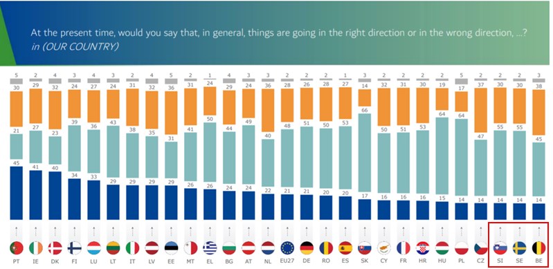 Povsem enako skeptični so Švedi glede tega, ali gredo stvari v pravo ali napačno smer v Evropski uniji (glede tega smo Slovenci bolj optimistični, Švedi na dnu s Francozi in Belgijci), povsem na dnu so tudi glede optimizma, da bodo novi projekti EU Švedski v postcovidnem obdobju pomagali sanirati zdravstveno, ekonomsko in socialno škodo.