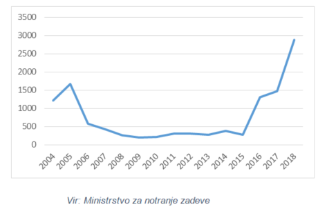 Poleg nezakonitih prehodov meje pa močno narašča tudi število prošenj za mednarodno zaščito, ki kaže dolgoročni trend v tej smeri. V letu 2016 je za mednarodno zaščito zaprosilo 1.308 oseb, v letu 2017 1.476, v letu 2018 pa kar 2.875 oseb. V primerjavi z letom 2017 je število prošenj naraslo za skoraj 95 %, v primerjavi z letom 2016 pa to pomeni skoraj 220-odstotno povečanje. Največ prosilcev prihaja iz Afganistana, Alžirije, Pakistana, Iraka, Irana, Sirije, Turčije, Maroka in Eritreje.