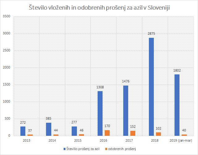 Število vloženih prošenj za azil in število odobrenih. V Sloveniji na konec postopka počaka zgolj vsak peti prosilec. (podatki za 2019 so od januarja do junija)