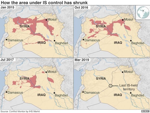Kako se je skozi čas krčil Islamski kalifat (vir slike: BBC)