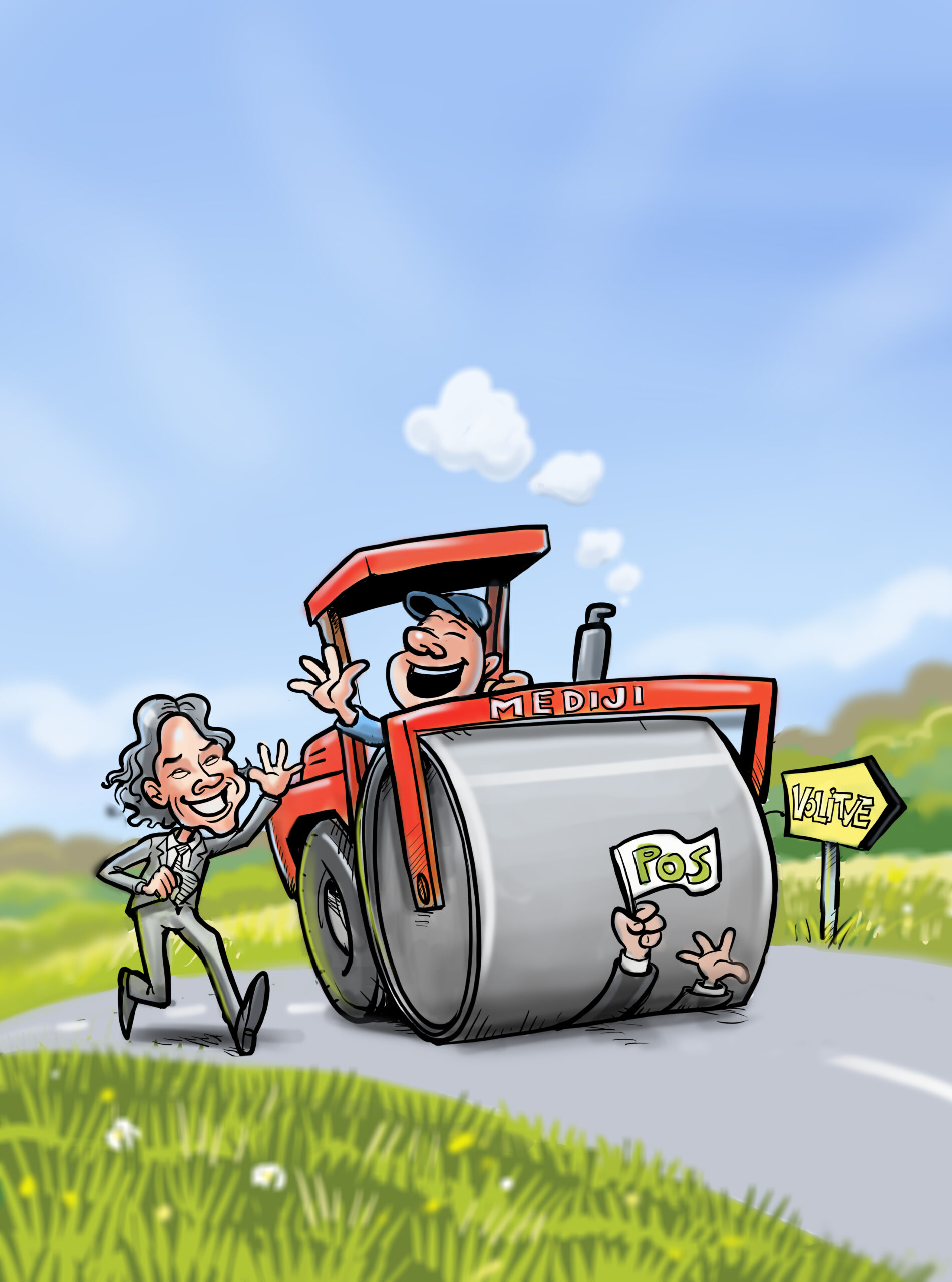 Karikatura z naslovnice 34. številke tednika Domovina o tokratni vroči temi: medijski valjar tlači gibanje Povežimo Slovenijo. V svoje in Golobovo veliko veselje.