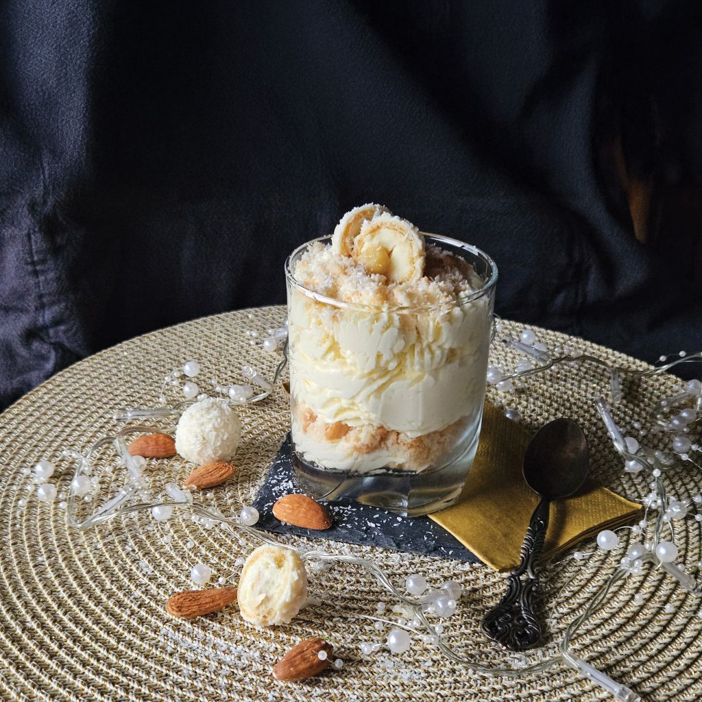- V kozarčke najprej naložimo plast mletih piškotov, da prekrijemo dno. Dodamo nekaj žlic pripravljene kreme, nato spet plast mletih piškotov. Zaključimo s kremo, ki jo posujemo z mletimi piškoti in kokosovo moko. Dekoracijo zaključimo s kokosovim pralinejem.