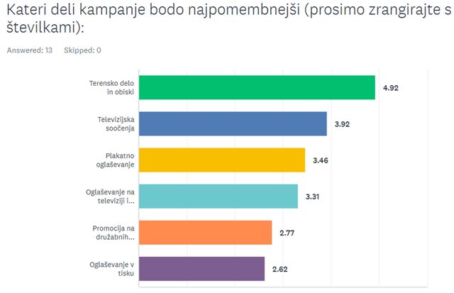 Večina sodelujočih je najpomembnejšo vlogo pripisala terenskemu delu, oziroma obiskom na terenu, nato televizijskim soočenjem, plakatnemu oglaševanju, oglaševanju na televiziji, promociji na družabnih omrežjih in na zadnjem mestu oglaševanju v tisku.