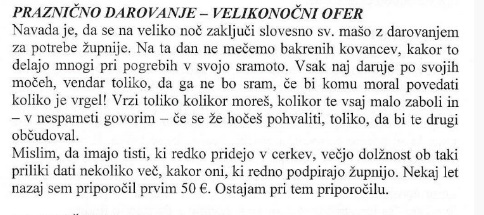 Po spletnih omrežjih je čez vikend zaokrožilo "povabilo" Ihanskega župnika k darovanju velikonočnega ofra, ki naj ne bo v bakru, saj je darovalcu to v sramoto. Za tiste, ki cerkev od znotraj vidijo bolj poredko, je priporočen dar 50 €. Župnik je besedilo objavil celo na spletni strani župnije in seveda ni trajalo dolgo, da so to novico pograbili mediji in se razpisali o župnikovih prazničnih podukih.