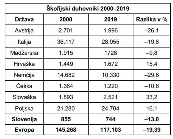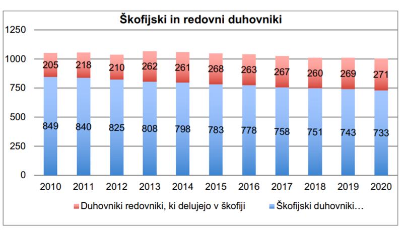 V istem obdobju se je število škofijskih duhovnikov v Sloveniji zmanjšalo za 17,55 %, število redovnih pa za 7,5 %. Število duhovnikov v Sloveniji je tako zdrsnilo pod 1.000.