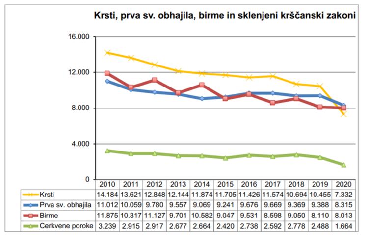 Število nedeljskih obiskovalcev svetih maš, ki je v letu 2019 prvič padlo pod 200 tisoč, se je v prvem letu korone praktično prepolovilo, cerkvenih porok je bilo samo 1.664 oziroma 40 % manj kot pred dvajsetimi leti, v letu 2020 je bilo krščenih zgolj še 38 % v Sloveniji rojenih otrok.