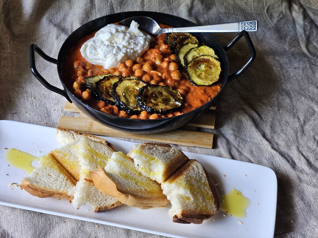 - Medtem v vroči namaščeni ponvi ali na žaru opečemo na tanjše kolobarje narezano in soljeno bučko. Ko so kolobarji bučke z obeh strani lepo pečeni, jih odstavimo na papirnato brisačko, da vpije odvečno maščobo. Na ponvi oziroma na žaru opečemo še rezine kruha.