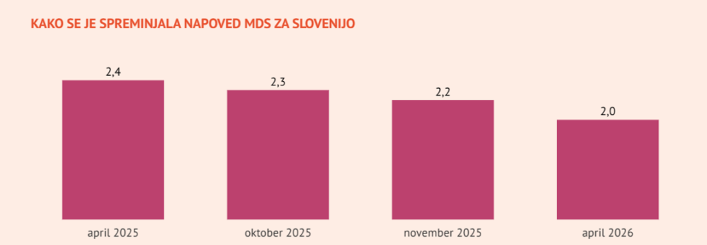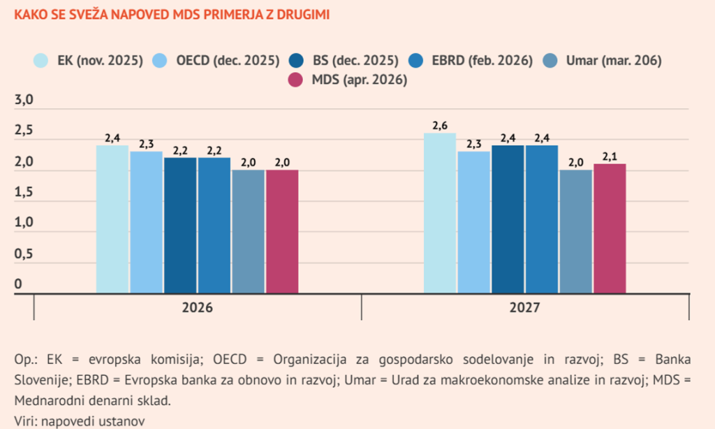 Če primerjamo projekcije različnih institucij, je MDS trenutno med bolj previdnimi. Podobno zadržano ocenjuje tudi Urad RS za makroekonomske analize in razvoj, medtem ko sta bili Evropska komisija in Banka Slovenije ob zadnjih napovedih bolj optimistični. Razlika izhaja predvsem iz časa objave – novejše napovedi že vključujejo aktualna tveganja.