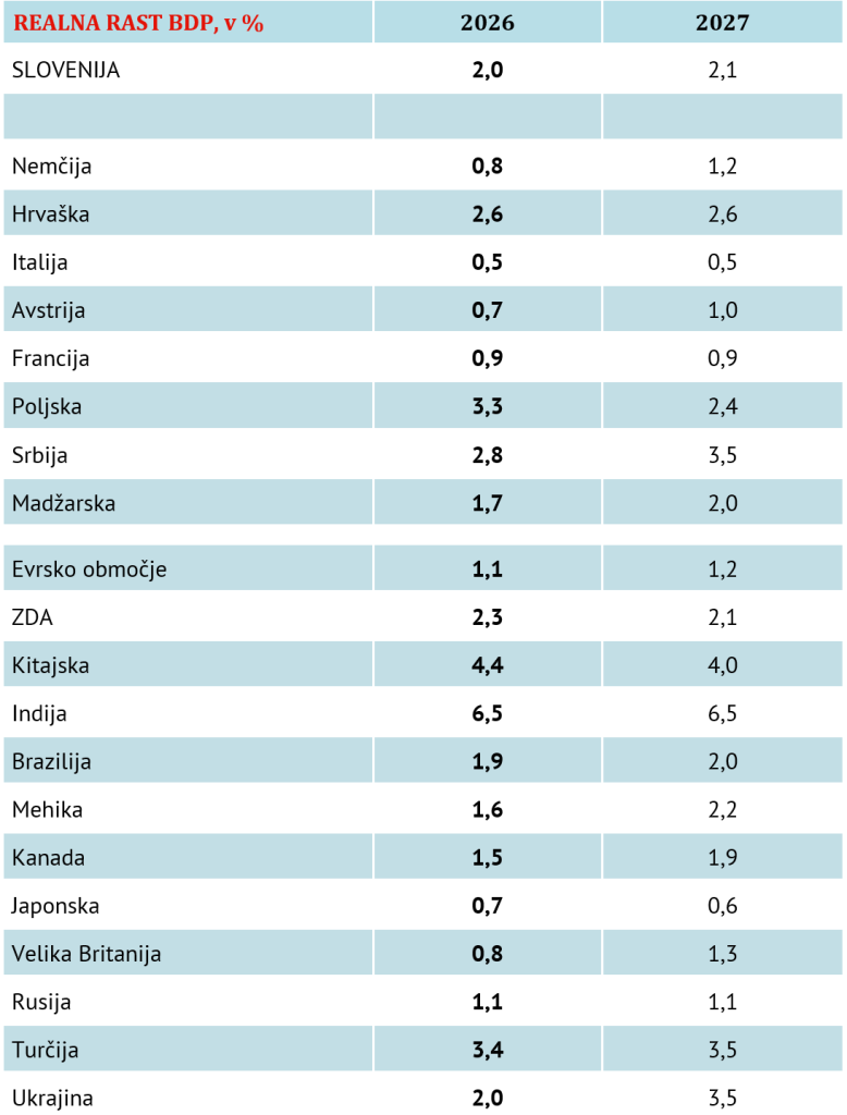 - Avstrija: rast 0,7 % – kot ena najtesnejših gospodarskih partneric neposredno vpliva na slovenske izvoznike.