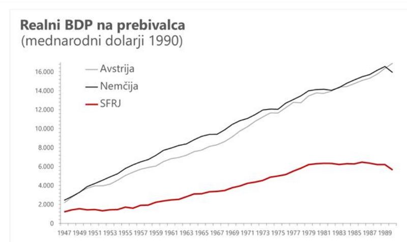 Če pogledamo enega najbolj splošnih kazalnikov - realne rasti BDP na prebivalca v Jugoslaviji in Sloveniji, vidimo (spodnji graf), da je v Socialistični federativni republiki Jugoslaviji ta v najboljših letih znašal nekaj čez 6.000 dolarjev na prebivalca. Rast BDP pa je bila mnogo nižja kot v "kapitalističnih" Avstriji in Nemčiji.