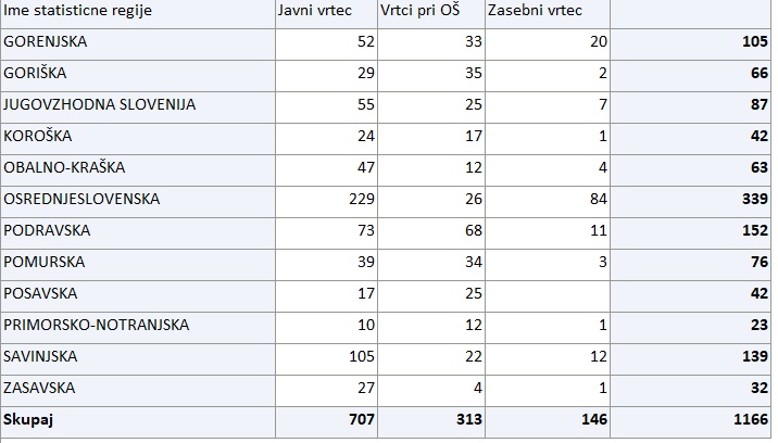 Tabel: število enot in vrtcev šolsko leto 2018/19