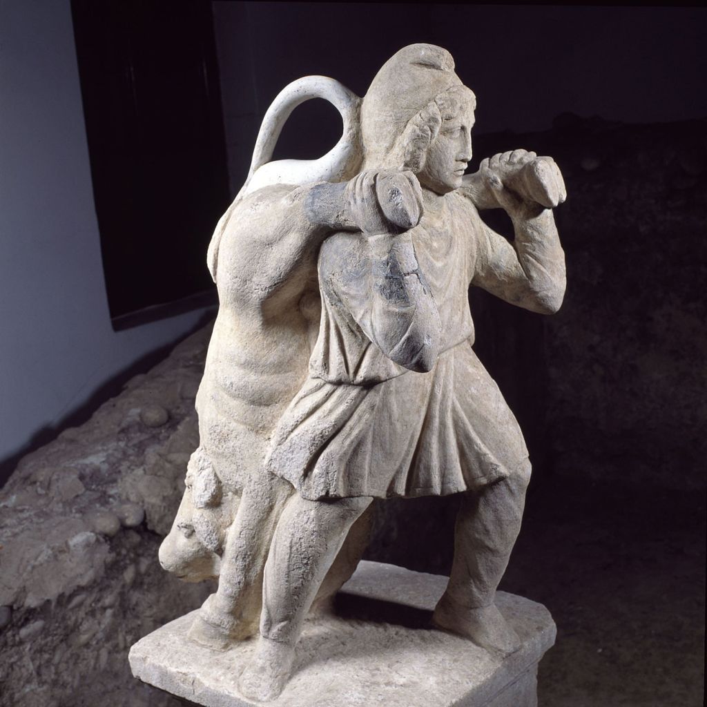 O kultu je največ znanega iz odkritij v mitrejih, namenjenih obrednim sestajanjem. Običajno so bila to skrita mesta, največkrat v votlinah. V mestih so bila svetišča zgrajena neredko v kleteh ter opremljena s kultnimi podobami Mitra, izvirom vode in s podestom na vsaki strani, kjer so častilci napol leže spremljali obredje. Na naših tleh so odkriti sledovi 22 mitrejev, samo na Ptuju jih je kar pet. Prvi mitrej na Spodnji Hajdini, ki so ga dali postaviti petovionski carinski uradniki sredi 2. stoletja, ima veliko nekdanje tempeljske opreme. Med zahvalnimi napisi sta ohranjeni tudi dve izjemni dragotini, kip Mitr z bikom na ramah in rojstvo iz skale. Bikonosec je izjemen v svetovnem merilu, je eden od vsega dveh v celoti ohranjenih in je po umetniškem izrazu daleč najboljši. Mitra je prikazan v kratki tuniki, hlače in koničasta čepica izdajata njegov vzhodnjaški izvor. Upodobljen je v trenutku, ko bika zgrabi za zadnje noge, si ga zadene na rame in ga odvleče k žrtvovanju. Mitra, zavezan božanskemu poslanstvu sostvarstva življenja, strmo upira pogled v prihajajoči akt žrtvovanja. Kip, sijajno umetniško delo, krasi oltarni podstavek. Napis izpričuje, da ga je dal postaviti Gaj Cecina Kalpurnij, ki je na svoje stroške obnovil tudi svetišče.