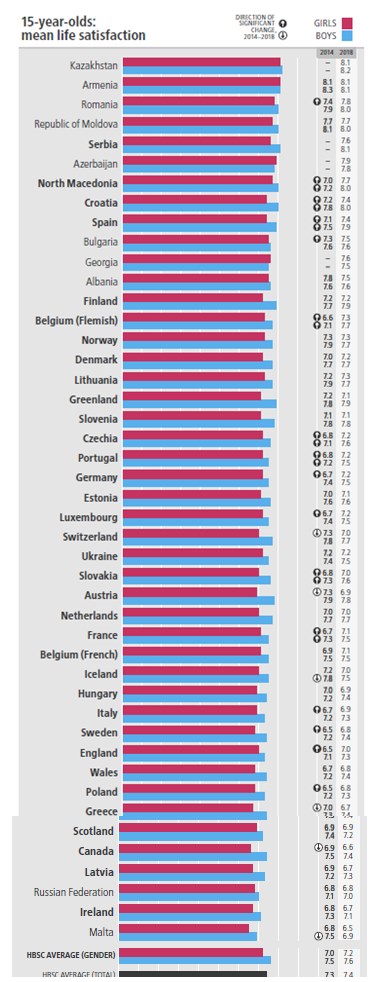 Podobno je pri zadovoljstvu z življenjem. Največ petnajstletnikov je z življenjem zadovoljnih v Kazahstanu, Armeniji, Romuniji, Moldaviji in Srbiji. Najmanj pa na Malti, na Irskem, v Rusiji, Latviji, Kanadi, na Škotskem in v Grčiji. Slovenci smo nekje na zgornjem robu držav sredine lestvice.