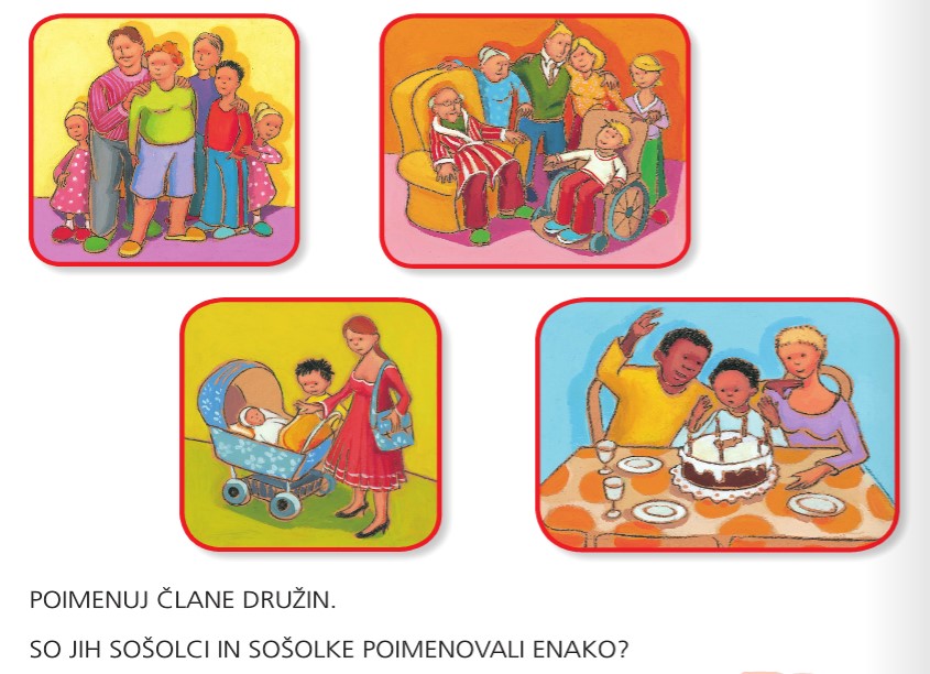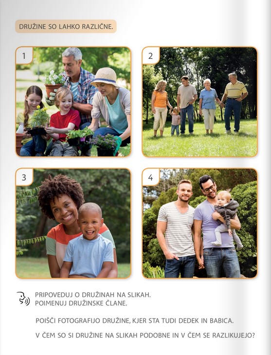 Pod fotografijami pa nato sledi navodilo prvošolcu, naj pripoveduje o družinah na slikah, naj poimenuje družinske člane ter opiše, v čem so si družine na fotografijah podobne in v čem različne. Interpretacija in izvedba aktivnosti je v celoti prepuščena učitelju.