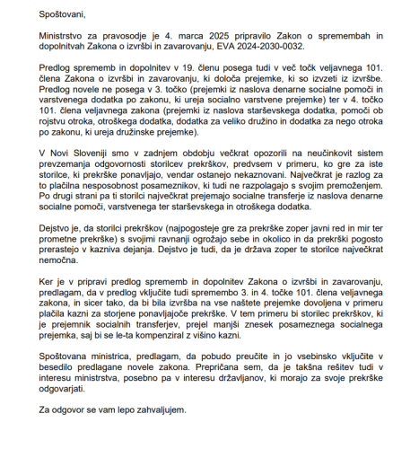 Poslanka je pozvala pravosodno ministrstvo, naj to spremembo vključi v zakon o izvršbi in zavarovanju, ki ga trenutno pripravlja. »Ker je v pripravi predlog sprememb in dopolnitev Zakona o izvršbi in zavarovanju, predlagam, da v predlog vključite tudi spremembo 3. in 4. točke 101. člena veljavnega zakona, in sicer tako, da bi bila izvršba na vse naštete prejemke (socialna pomoč, varstveni ter starševski in otroški dodatek) dovoljena v primeru plačila kazni za storjene ponavljajoče prekrške. V tem primeru bi storilec prekrškov, ki je prejemnik socialnih transferjev, prejel manjši znesek posameznega socialnega prejemka, saj bi se ta kompenziral z višino kazni,« je poslanka med drugim predlagala ministrici Andreji Katič. Poslanka, ki živi v jugovzhodni Sloveniji, je poudarila, da so spremembe nujne, saj trenutna ureditev daje prekrškarjem občutek, da jim je dovoljeno vse. Ker jim za njihova dejanja ni treba odgovarjati, z njimi nadaljujejo ali jih celo stopnjujejo. »Dejstvo je, da storilci prekrškov s svojimi ravnanji ogrožajo sebe in okolico, in da prekrški pogosto prerastejo v kazniva dejanja. Dejstvo je tudi, da je država zoper te storilce največkrat nemočna,« je opozorila in spomnila na svež posnetek, ki prikazuje, kako se »prejemniki socialne pomoči« norčujejo iz policistov – torej iz države in tudi iz vseh nas. »Policisti jim ne morejo nič, zgovoren pa je tudi molk ministra, morda se pripravlja na odstop,« je poslanka sicer izpostavila, da je tudi sam minister Boštjan Poklukar sedaj ugotovil, da je »konec z varnostno romantiko«. »V stranki NSi smo prepričani, da samo z molkom ne bomo prišli nikamor,« je še poudarila poslanka, ki je izpostavila, da bi pred zakonom morali biti vsi enaki. »Prejemnikom socialne pomoči pa se smeji, saj vedo, da se jim nič ne more zgoditi,« je komentirala in dodala, da je treba ukrepati takoj, sicer se bo situacija le še poslabševala.