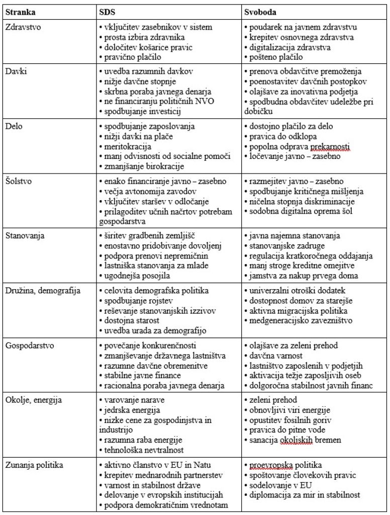 Programske smernice za prihajajoči mandat so javno objavile skoraj vse navedene stranke, podrobneje so bile predstavljene na volilnih konvencijah. To so storili tudi v Gibanju Svoboda, zanimivo pa je, da od leta 2022, ko so sprejeli program za iztekajoči se mandat, na njihovi spletni strani v tem pogledu ni dostopen noben nov dokument. Svoboda se torej na nedeljske volitve podaja praktično brez programa za prihodnji mandat. Pri analizi smo zato upoštevali tistega izpred štirih let.