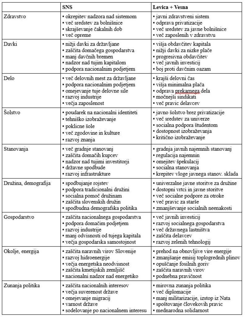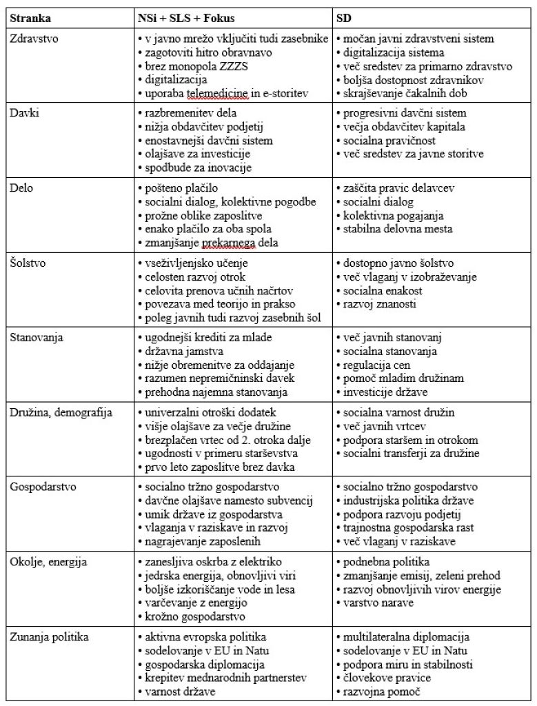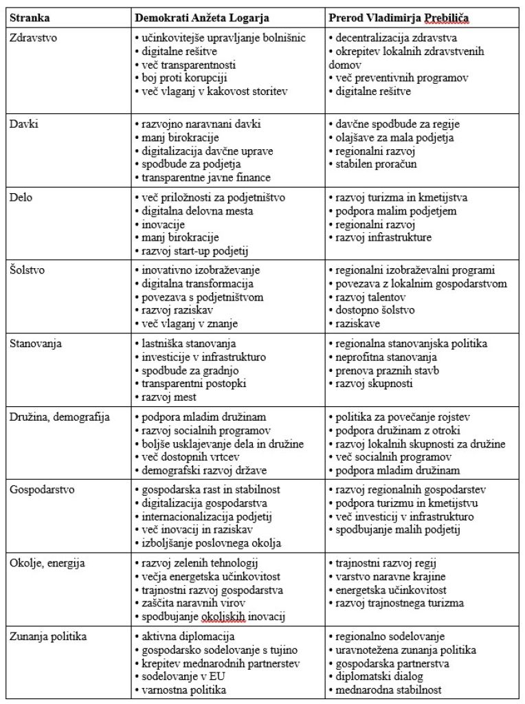 Gre le za osnovna izhodišča politik strank. Zagotovo ima vsaka posamična v programu tudi marsikaj, česar tu ni navedenega, a o nekih osnovnih smernicah razvoja države, kot ga vidijo pretendenti za parlamentarne stolčke in vladne položaje, je najbrž tudi iz navedenih informacij mogoče sklepati.