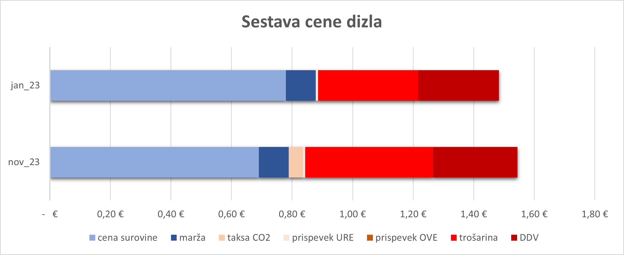 Pri dizlu je razlika manjša, saj je vlada poleti znižala trošarino na dizel, še vedno pa je ta opazno višja, kot je bila na začetku leta. Vlada si pri dizlu vzame 9 centov več trošarine in cent več DDV, saj je cena surovine trenutno nekoliko nižja, kot je bila v začetku leta.