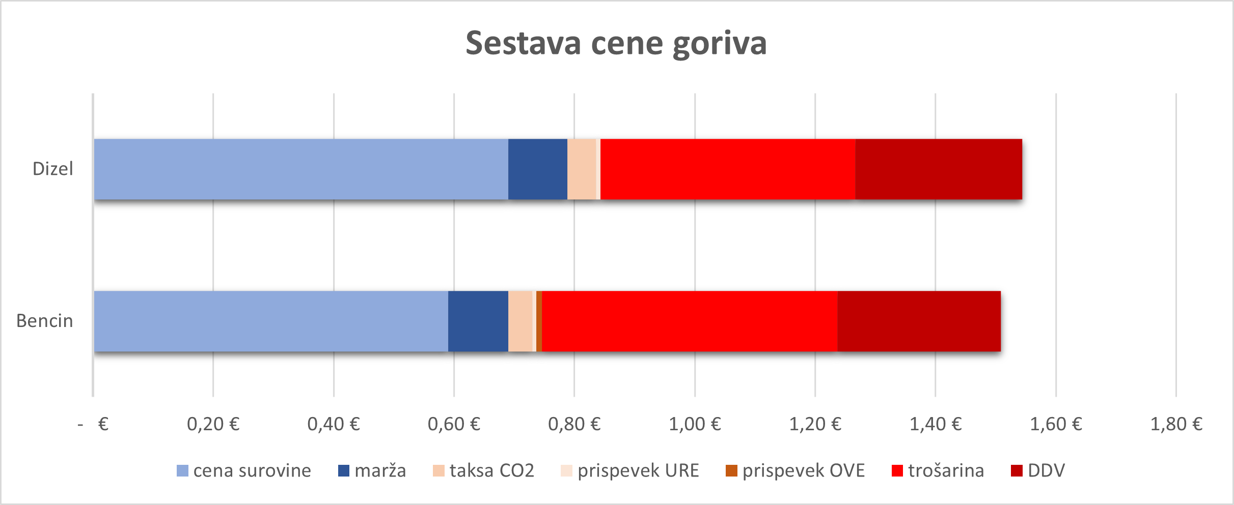 Vse ostalo predstavljajo navadni davki, s katerimi država polni proračun: Trošarina trenutno 49 centov, DDV pa 27 centov oz. skupaj 76 centov. Pri ceni goriva si trenutno trgovec zase vzame manj kot 10 centov, približno 60 centov porabi za surovino, preostalih 82 centov pa si vzame država.