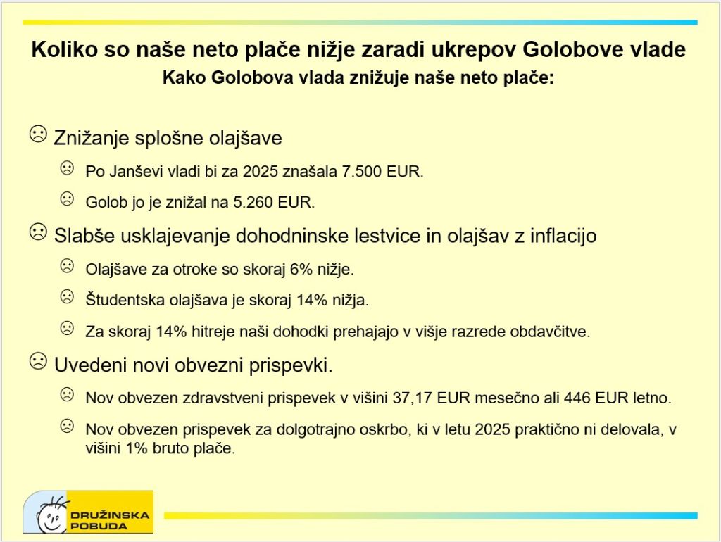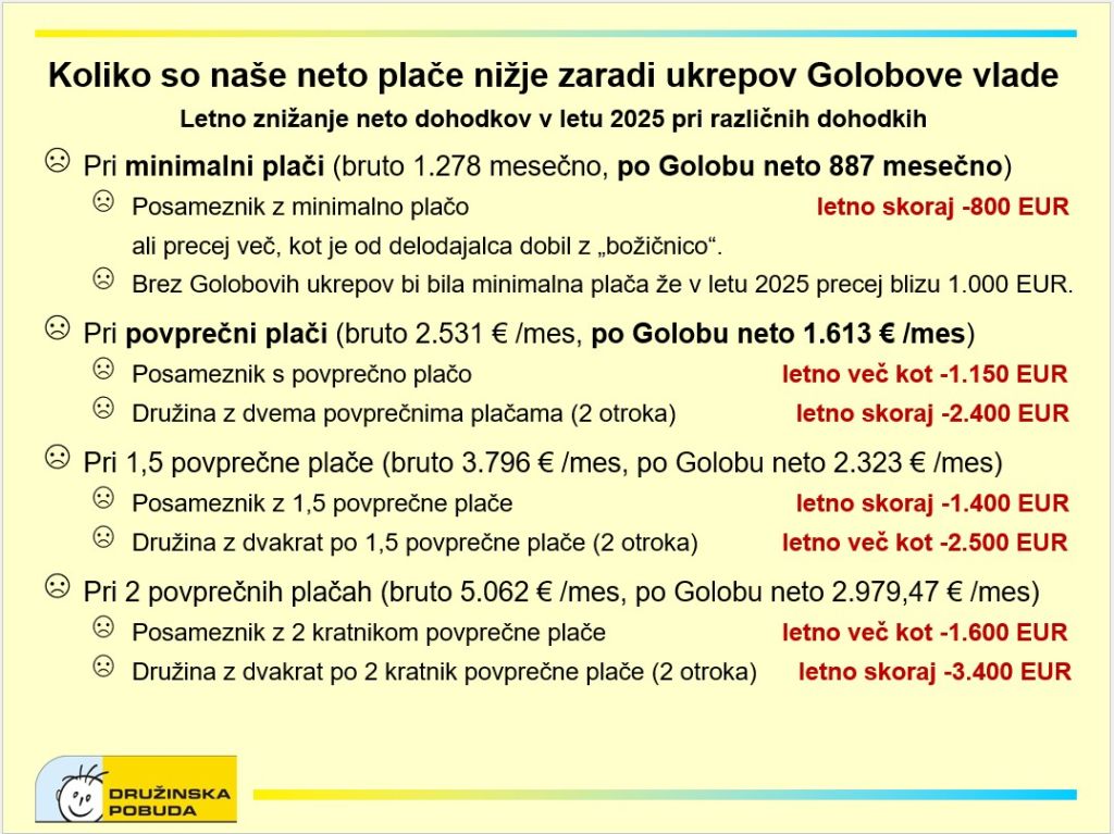 Zaradi ukrepov Golobe vlade ima nekdo pri minimalni bruto plači 1.278 evrov mesečno neto 887 evrov mesečno, letno manj skoraj 800 evrov, kar je precej manj denarja, kot jih je od delodajalca prejel z božičnico. Brez Golobovih ukrepov bi bila minimalna plača že v letu 2025 precej blizu 1.000 (953) evrov. Nekdo s povprečno bruto plačo 2.531 evrov mesečno, kar je neto 1.613 evrov mesečno, ima na letni ravni 1.150 evrov manj, kar je mesečno približno 95,83 evrov.