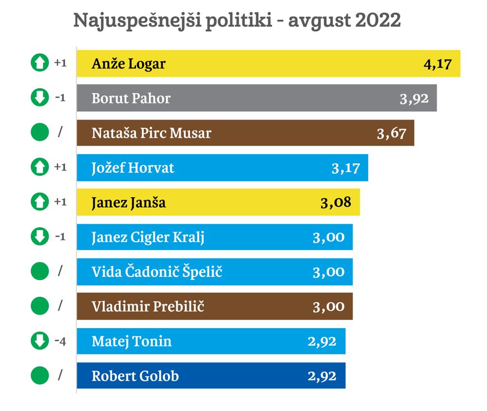 Aktualni predsednik Pahor ostaja visoko čislan med analitiki, dobro pa še vedno gre poslancem NSi-ja, med katere sta se vrinila Janez Janša in še en predsedniški kandidat, Vladimir Prebilič. Za rep je deseterico uspešnih politikov meseca maja ujel predsednik vlade Robert Golob.