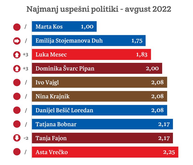Bojan Požar izpostavlja, da so poletni meseci bolj kot pozitivno politike zaznamovali negativno, "zlasti Luko Mesca in Asto Vrečko z njunimi reakcijami ob aferi Smodej, pa Dominiko Švarc Pipan, ki ne ploska, ko gre za Ukrajino, Marto Kos in propadu njene kandidature za predsednico republike ter tudi Nino Krajnik, ki se je med svojo predsedniško kandidaturo - tudi malo po nepotrebnem - dobesedno izgubila."