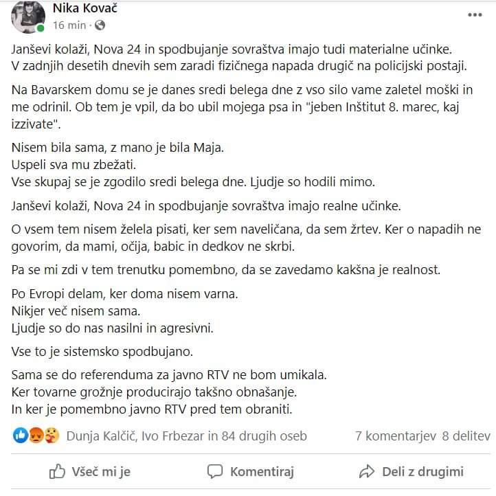 Dve leti se je drla po ulicah s tistimi, ki so hoteli ubijati, ko sama naleti na nekoga,ki jo malo odrine pa cel halo! Najprej; zavračam nasilje! Moje mnenje pa je, da stalno vzpodbujanje napetosti prav lahko pri kaki nestabilni osebi povzroči nasilen odziv, naj bo na levi ali desni. V dveh letih Janševe vlade so se z leve strani provokacije dogajale iz dneva v dan, mene je bilo prav strah kdaj bo imel nekdo tega dovolj in se mu bo utrgalo. Kako so se spravili na g. Kreka in g. Horvata, pa je bilo vse označeno za sprejemljivo, pač javne osebnosti. Zdaj se sliši kako grdo je če se nekdo spravi na žensko, res je grdo, enako grdo je, če se kdo spravi na starejšega človeka. Tudi Nika Kovač je javna oseba, veljajo zanjo druga merila kot za one na desni?