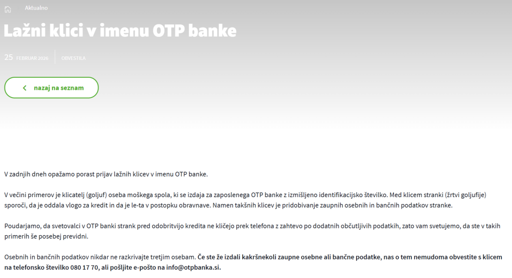 Namen takšnih klicev je pridobivanje zaupnih osebnih in bančnih podatkov stranke. Tudi pri njih poudarjamo, da svetovalci v OTP banki strank pred odobritvijo kredita ne kličejo strank prek telefona z zahtevo po dodatnih občutljivih podatkih, zato svetujemo, da ste v takih primerih še posebej previdni.