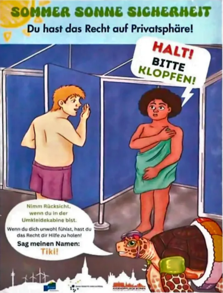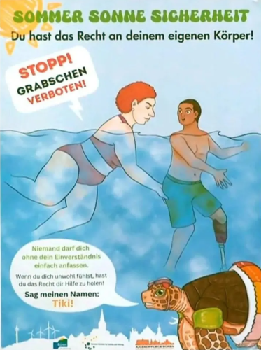 Plakat na zunanjem bazenu v Bürenu v Severnem Porenju-Vestfaliji tako denimo prikazuje močnejšo rdečelaso žensko, ki otipava zadnjico temnopoltega fanta s protezo. Nad risbo sta napisa »Zaščita pred poletnim soncem« in »Stop! Brez otipavanja.«