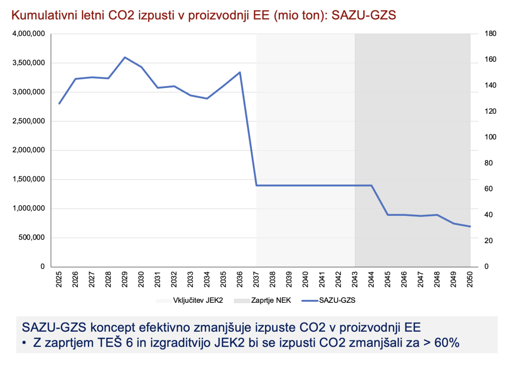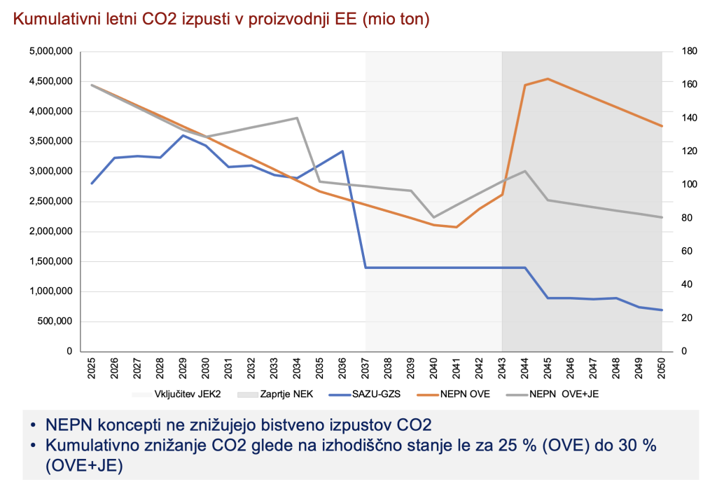 Študija sklene z ugotovitvijo, da sistemi z energijo iz vetra, ki jih je treba balansirati s plinom, niso vzdržni z vidika izpustov. Z več električne energije iz obnovljivih virov sonca in vetra ne moremo razogljičiti proizvodnje elektrike, ne v teoriji, še manj pa v realnem svetu, zapiše Damijan. Na spodnjih dveh slikah so primerjave letnih izpustov CO2 v proizvodnji električne energije med konceptom SAZU-GZS (NEK, JEK2, hidro- in sončna energija) ter obeh konceptov NEPN (veliko sonca v obeh ter scenarij obnovljivih virov energije brez JEK2). Izpusti CO2 v primeru SAZU-GZS bi se po izgradnji JEK zmanjšali za več kot 60 %, medtem ko bi se izpusti CO2 v primeru NEPN scenarijev znižali le za 25 do 32 %.