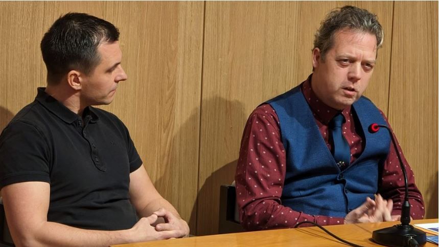 Tino Mamić in Boris Oblak s člani Društva slovenskih izobražencev o slovenskih medijih