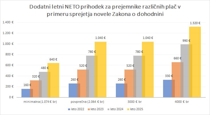Postopni dvigi neto prihodkov na letni ravni so razvidni iz spodnjega grafa (posebne olajšave niso upoštevane). Kot vidimo, bo nekdo na minimalni plači prvo leto prejel 160 € več, naslednje leto 320 € več, nato 480 € več in na koncu 640 € več denarja. Nekdo na povprečni plači pa prvo leto 260 € več, naslednje leto 520 € več, nato 780 € več in leta 2015 dobrega tisočaka več v žep. Itd.