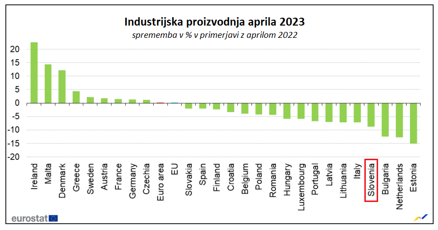 Kljub temu pa se je pojavila zaskrbljujoča statistika, ki kaže na močan padec industrijske proizvodnje v Sloveniji. Ta je v aprilu na mesečni ravni padla za 7,9 odstotka, kar je največ v Evropski uniji. Po mnenju Gospodarske zbornice Slovenije (GZS) je upad nedvomno pokazatelj, kako občutljiva je slovenska industrija na visoke stroške energentov.