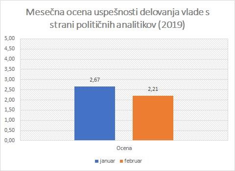 Sodelujoči politični analitiki so bili do dela vlade v februarju zelo kritični, precej bolj kot mesec poprej. Vlada je dobila zgolj eno odlično oceno, dve dobri, devet zadostnih in dve nezadostni. Povprečje je tako skoraj za pet desetink točke nižje kot januarja.