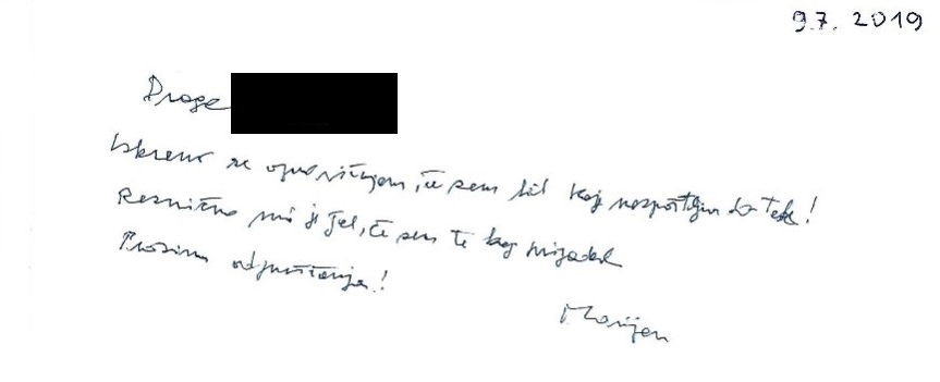Zupanc ji je napisal tudi opravičilo, v katerem se ni opravičil konkretno za zlorabe, vseeno pa je prosil odpuščanja.