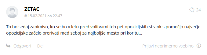 Dajte no Igor, malo se skulirajte. Obnašate se kot razvajen otrok, ki mora brcnit prav v vsako potičko v peskovniku. Ko pa kdo brcne vašo, pa takoj v jok pa na drevo. Politika je umetnost komuniciranja in sklepanja kompromisov z namenom uresničevanja lastnega programa v čim večji meri. To naj bi vsaj bila. Če stojite na stališču, da ste pripravljeni poslušati le lastno mnenje, programa pa sploh nimate, je pač z vami težko. Jaz recimo bi zelo rad videl vsebino vaše opcije in alternativna politična ponudba je vedno dobrodošla. Pravite, da ste član LMŠ. Ko ste sestavljali vlado ste imeli programa toliko, da ste ga spravili na en ekran pametnega telefona. Je po dobrih dveh letih glede tega že kaj bolje ali ste še vedno na "Samodanijanšačenismominaoblastinidemokracije" (temu dodajte poljubno število klicajev)?