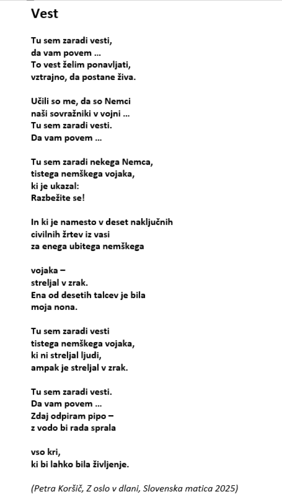 Vse to bomo lahko ob bogati vsebini videli v oddaji, v kateri sta sodelovala Teja Prinčič in Silvan Koršič. V pričevanju boste slišali tudi pesem Petre Koršič, ki subtilno, na pesniški način, ovrednoti tragedijo v Cerovem, ki jo je njena stara mama – nona, po posredovanju nemškega vojaka preživela.