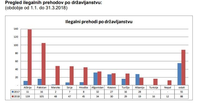 Do konca marca 2018 so policisti na območju Republike Slovenije obravnavali 612 ilegalnih prehodov državne meje. Število se je v primerjavi z istim obdobjem lani povečalo za 200 %, lani sta mejo ilegalno prestopila 202 migranta.