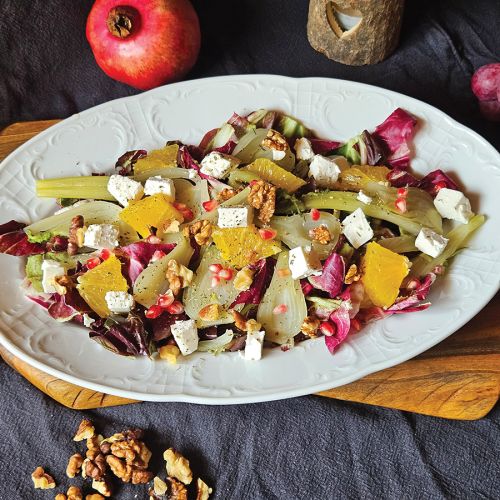Količina: za 2–4 osebe Zahtevnost: Enostavno Čas priprave: 20 minut Sestavine 3 manjši koromači (janeži) 1/2 manjše glave jesenskega radiča 1 pomaranča 100 g feta sira pest orehovih jedrc pest zrnc granatnega jabolka sol origano oljčno olje jabolčni kis Postopek...