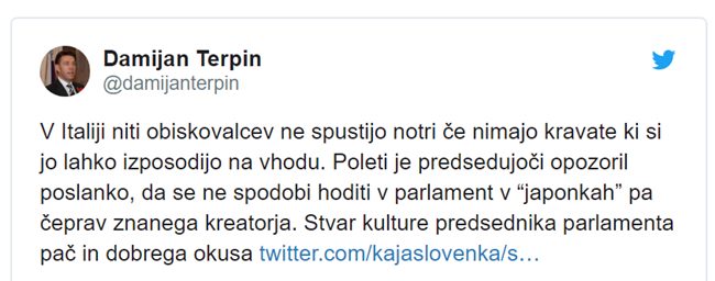 "V Italiji niti obiskovalcev ne spustijo v parlament, če nimajo kravate ki si jo lahko izposodijo pri vhodu. Poleti je predsedujoči opozoril poslanko, da se ne spodobi hoditi v parlament v “japonkah”, pa čeprav znanega kreatorja. Stvar kulture predsednika parlamenta pač in dobrega okusa."