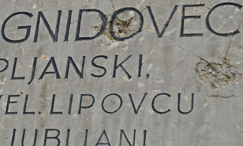 Spominska plošča škofa Janeza Gnidovca na Ajdovcu in sledovi partizanskih krogel na njej. Foto: Ivo Žajdela