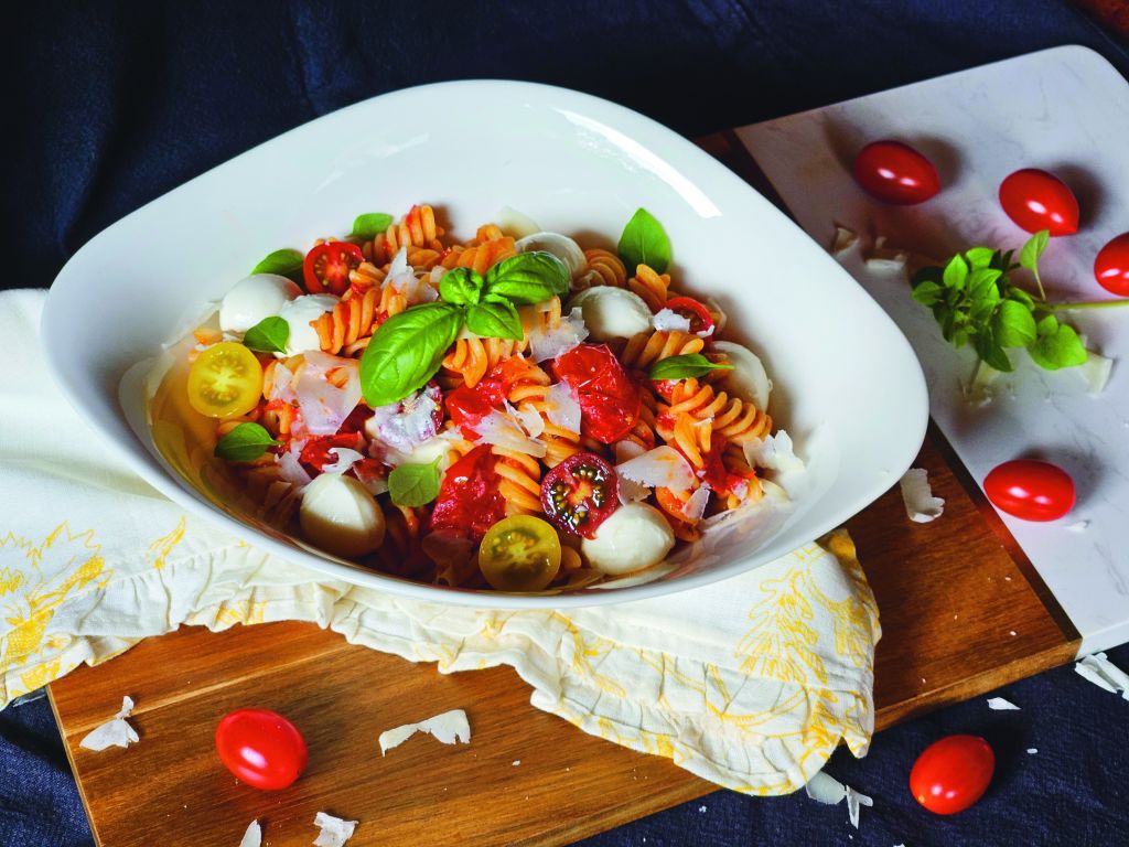 Pašto »Caprese« okrasimo s svežimi listi bazilike in posujemo s sveže naribanim parmezanom.