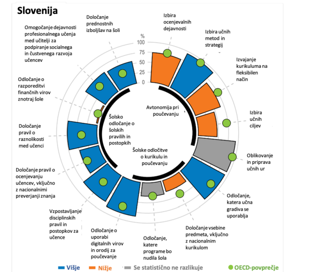 Delež učiteljev, ki poučujejo v šolah, kjer ima več kot 10 odstotkov učencev posebne izobraževalne potrebe, je 48 odstotkov (podobno kot povprečje OECD: 46 %). Delež učiteljev v teh šolah se je med letoma 2018 in 2024 povečal za 21 odstotnih točk. Več kot tretjina učiteljev (37 %) v povprečju med izobraževalnimi sistemi v OECD poroča, da je prilagajanje pouka učencem s posebnimi potrebami zanje stresno. V Sloveniji je prilagajanje pouka učencem s posebnimi potrebami stresno za okoli 40 odstotkov učiteljev v osnovni in 30 odstotkov v srednji šoli. V povprečju OECD 62 odstotkov učiteljev meni, da lahko učne naloge precej ali zelo prilagodijo učencem s posebnimi izobraževalnimi potrebami, v Sloveniji pa 66 odstotkov učiteljev od prvega do šestega, 61 odstotkov učiteljev od sedmega do devetega razreda in 55 odstotkov srednješolskih učiteljev.