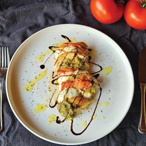 - Pečene vzamemo iz pečice. Vsako pica barčico obložimo z rezino kraškega pršuta, kavno žličko pesta iz bazilike in črno olivo.