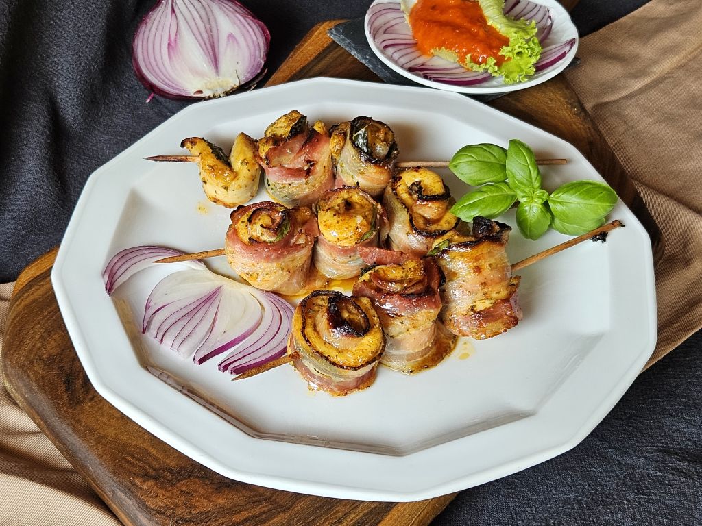 - Pečena piščančja nabodalca vzamemo iz pečice in jih takoj postrežemo. Poleg ponudimo še ajvar in narezano rdečo čebulo.