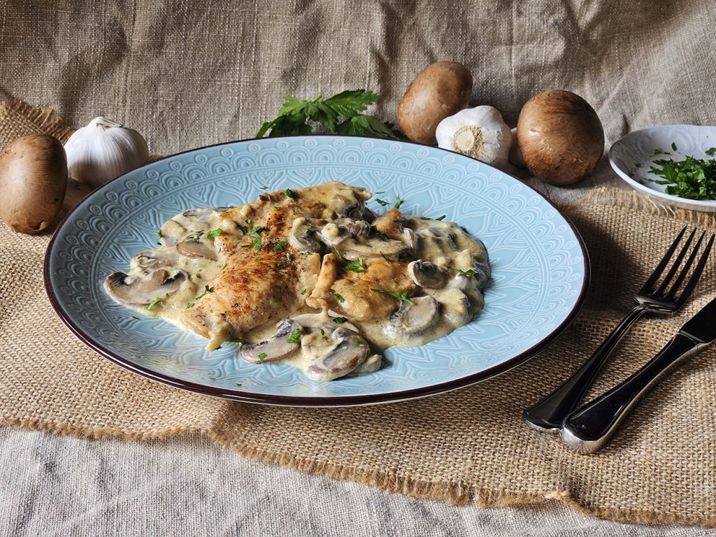 Piščančji file v česnovo-parmezanovi omaki s šampinjoni